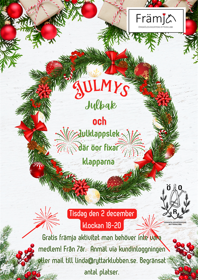 Hej alla medlemmar! Vi vet att ni är många som är intresserade av vad vi gör i styrelsen och vi har som avsikt att informera mer löpande kring vårt arbete framöver. För tillfället jobbar vi intensivt med lösningar kring finansiering som avser renoveringar och vidareutveckling av anläggningen, bl.a i form av att ansöka om olika bidrag. Under hösten har anläggningen fått ny belysning på stora utebanan, ridhusväggen och sargen är renoverade och en ny elektrisk port kommer installeras inom kort. Vi har även installerat elstolpar till hagarna nedanför kontoret så alla hagar nu kan koppla in el till hästarnas vattentunnor och inom kort byter vi även ut hela ridhusunderlaget. Det pågår också förhandlingar med Öviks kommun gällande anläggningsbidrag för 2026-2028. Så det är mycket som hänt och som vi arbetat med under året under och vi ser fram emot ett nytt spännande år 2026. Hälsningar Styrelsen Örnsköldsviksortens Ryttarklubb