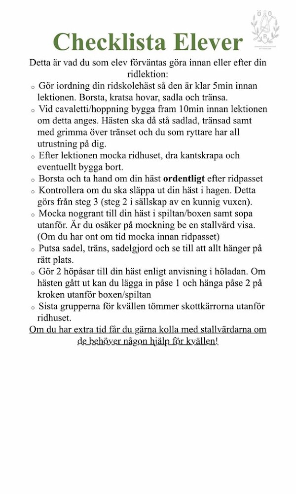 Här kommer information till nya elever och en påminnelse till gamla elever om vad som ska göras med hästen och i stallet innan/efter ridlektionen :) Klicka på pilarna nere i högra hörnet för att se hela bilden.