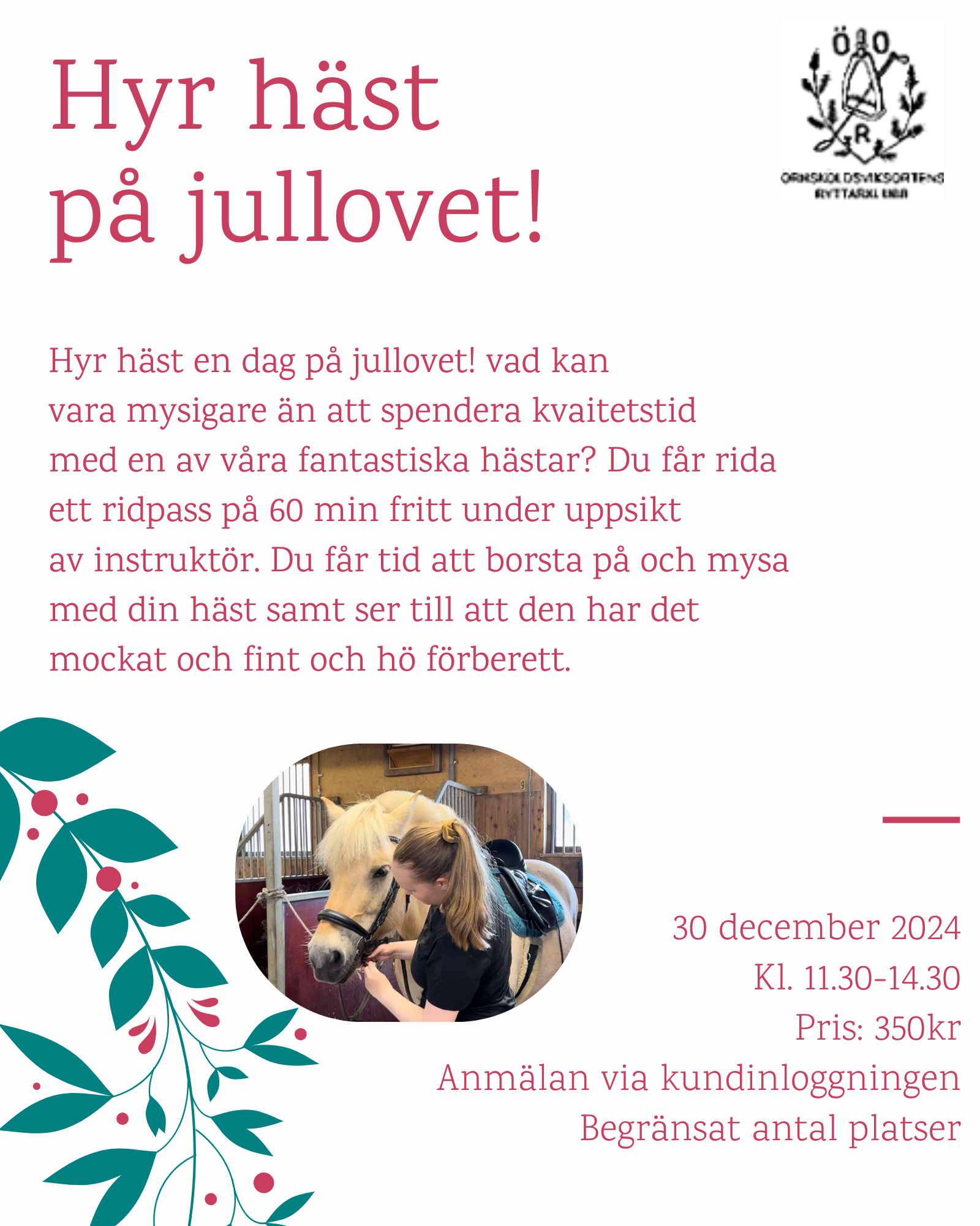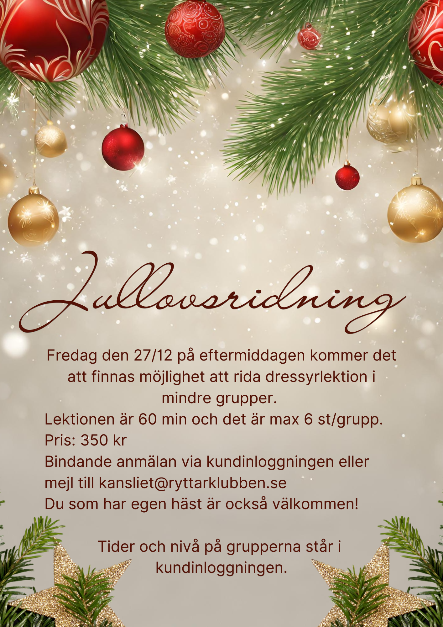 Julen närmar sig med stormsteg och vad kan väl vara en bättre julklapp än att få tillbringa mer tid i stallet tillsammans med 4- & 2-benta vänner. Självklart är både ridskoleelever och privatekipage välkomna!