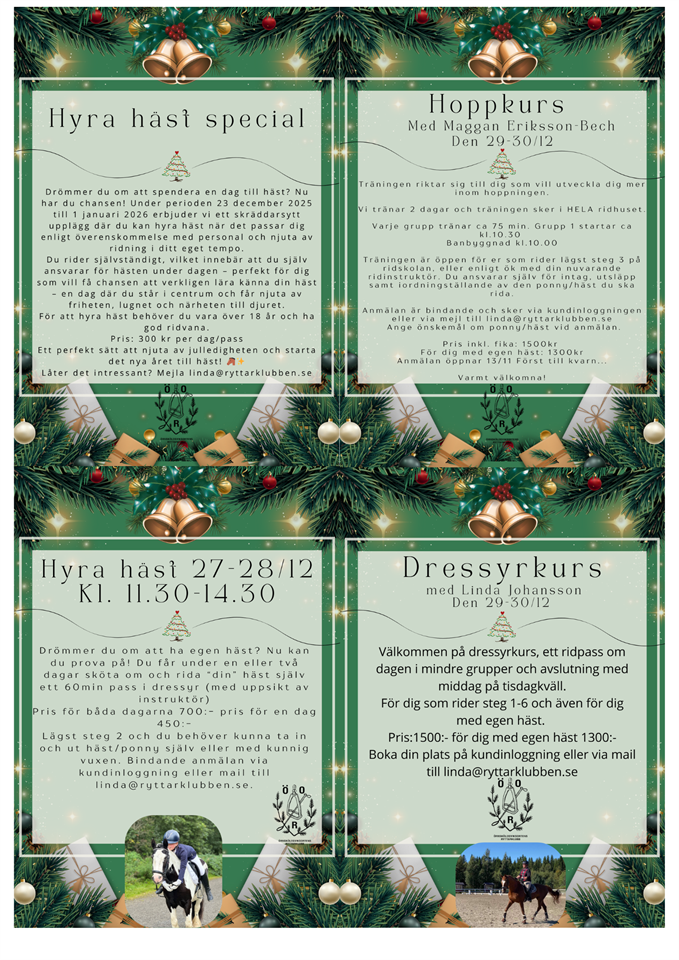 Snart är det jul igen! Här har du de perfekta julklapparna! Hoppkurs, dressyrkurs eller kanske hyra en häst? in och boka! Kl.18.00 den 13 /11 öppnar anmälan!