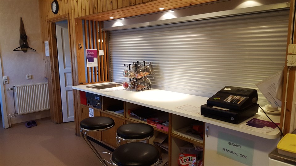 Vi håller på att fräscha upp i cafeterian. Vi har köpt en ny bänkskiva och lackat dörren i köket. Så här snyggt blev det :)