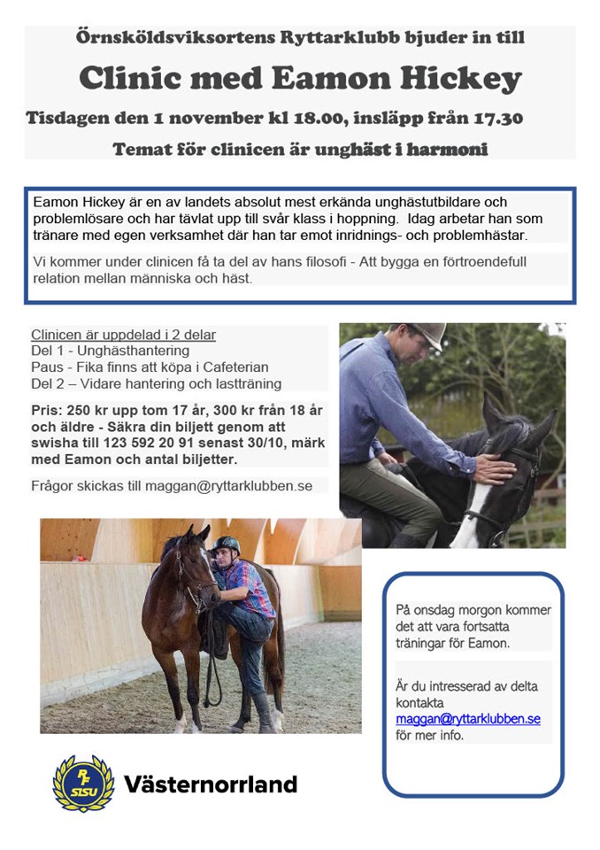 Nu kan vi stolta presentera att vi får besök av en av landets främsta och mest erkända unghästutbildare, Eamon Hickey! På clinicen kommer vi få ta del av Eamons filosofi när det gäller att bygga en förtroendefull relation med sin häst, på ett säkert och harmoniskt sätt. Den här kvällen vill ingen hästintresserad missa!!! Varmt välkomna!