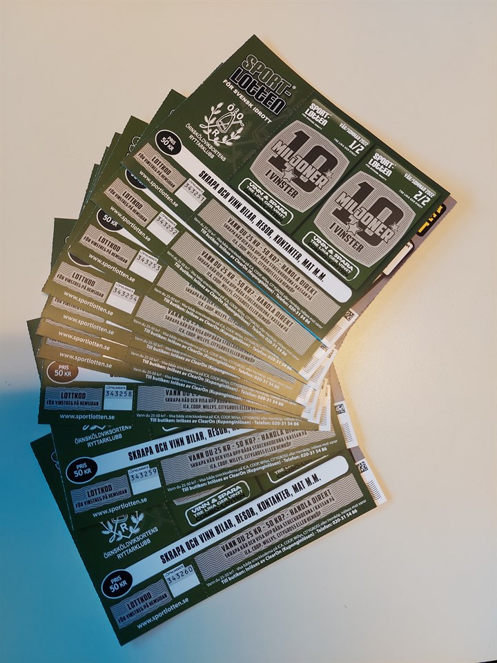 Nu har sportlotterna kommit så det går bra att hämta ut dem i stallkontoret på kvällarna. Vill du hämta på dagtid så går det också bra, sök reda på någon i personalen. Lotterna betalas vi faktura. På lotterna kan man vinna bilar, resor, kontanter, mat m.m. På baksidan av lotten finns även 4 rabattkuponger som man kan använda, det är rabatter på Ica, Cirkel K, Sibylla och Naturliga Norrland. Varje lott kostar 50 kr st. Alla ridelever och medlemsuppstallade kommer att sälja 12 st lotter var. Om man är flera i familjen eller rider flera gånger/vecka så säljer man 2 extra lotter/abonnemang. Självklart får även övriga medlemmar hjälpa till att sälja lotter för att stärka föreningens ekonomi. Säljtävling! Alla som säljer 30 lotter eller fler utöver det antal man måste sälja få boka in sig på en gratis drop-in lektion vid valfritt tillfälle. Nu hoppas vi på storvinst! Lycka till med försäljningen! Vi är bäst tillsammans!