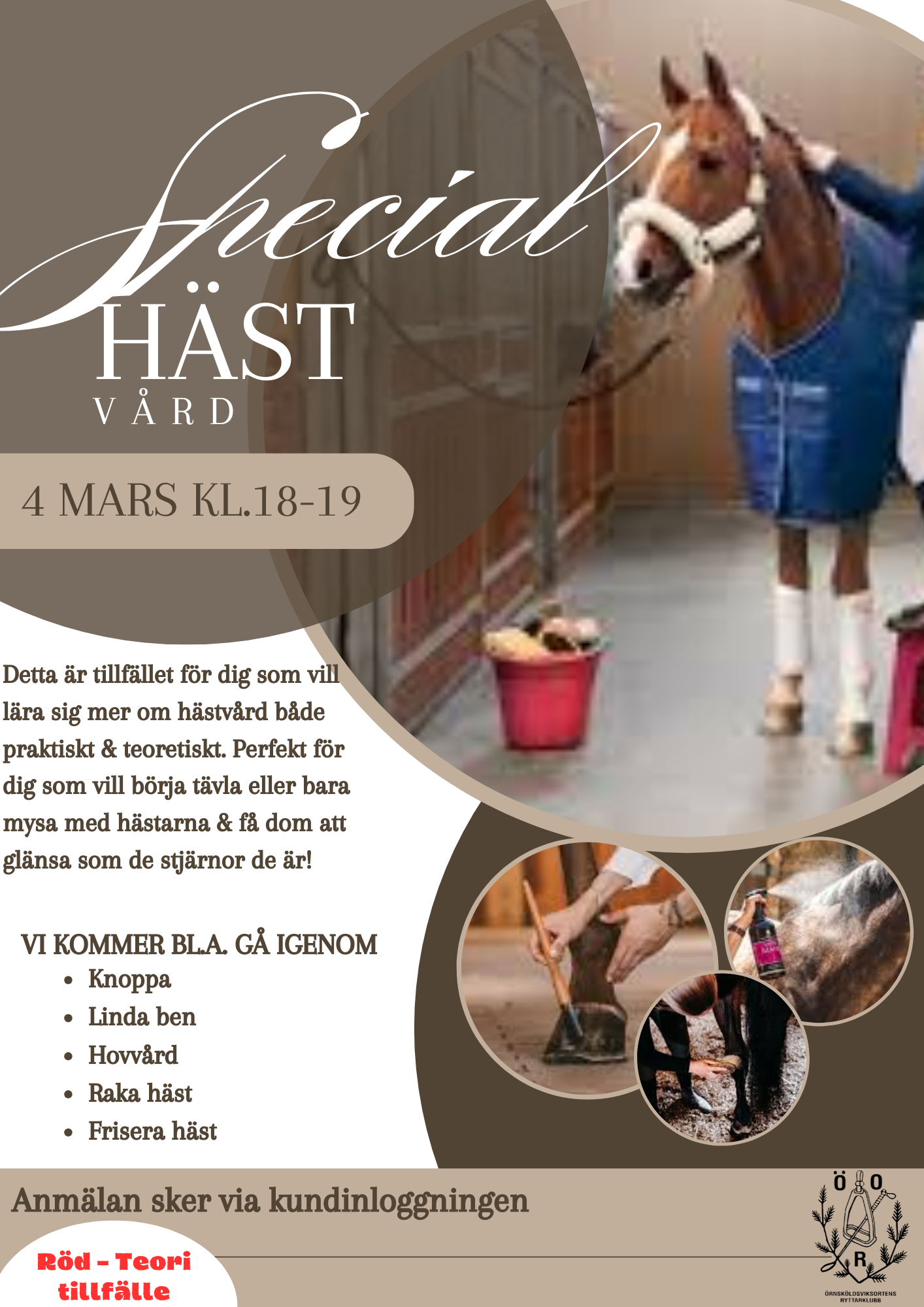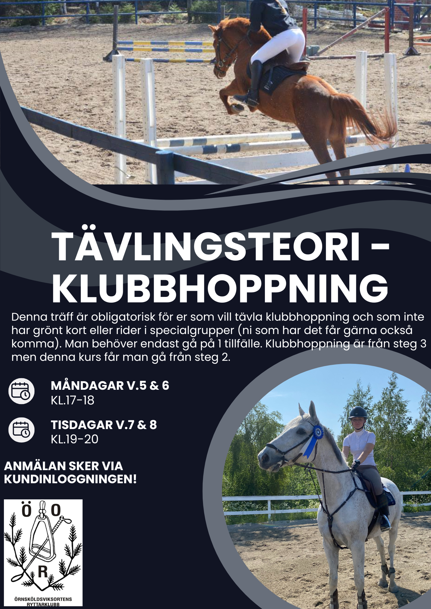 17/2 Röd teori - Hästvälfärdssnack18/2 Tävlingsteori obligatoriskt för alla som vill starta klubbhoppning. Gäller ej de som har gröntkort och/eller de som är med i en specialgrupp.