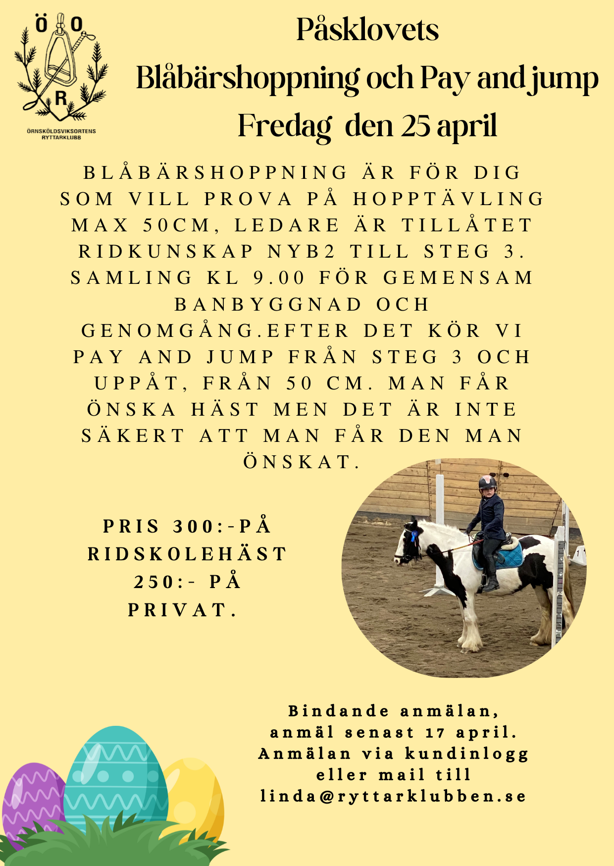 4/3 Blåbärshoppning och Pay and Jump4/3 Röd teori - Specialhästvård5/3 Utrustningskontroll6/3 Främjakalaset8-9/3 Hoppkurs15-16/3 Hopptränningar Leif Hall